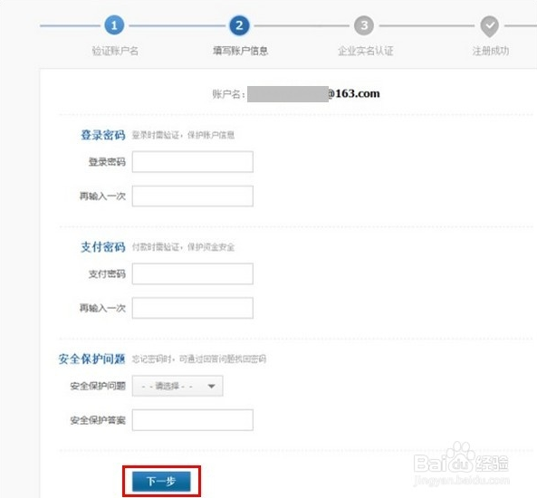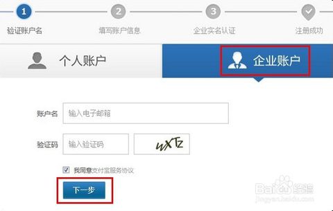 步聚二:點(diǎn)擊【企業(yè)賬戶】,填入電子郵箱和驗(yàn)證碼(公司賬戶只能郵箱注冊),點(diǎn)擊【下一步】;
