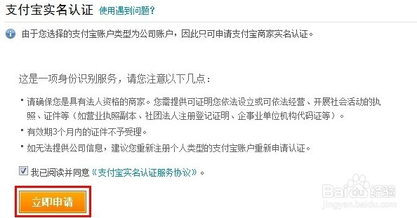 步聚七:申請公司類型的支付寶賬戶,需進(jìn)行支付寶實(shí)名認(rèn)證,點(diǎn)擊【立即申請】。