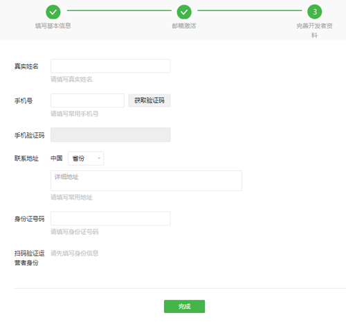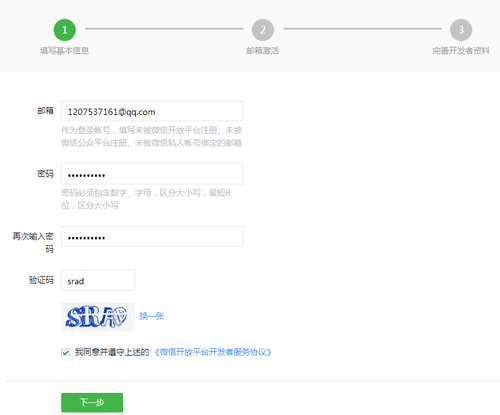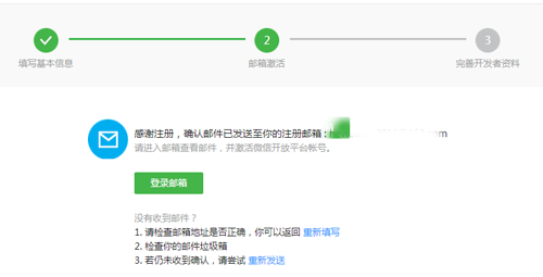 微信開放平臺注冊流程 聆科網絡 ? 發(fā)表于:2016/12/3 15:03:35 第一步:打開網址:https://open.weixin.qq.com/,點擊右上角的注冊,填寫基本信息。 第二步:填寫基本信息下一步后,激活郵箱 第三步:填寫開發(fā)者資料,提交即可注冊成功
