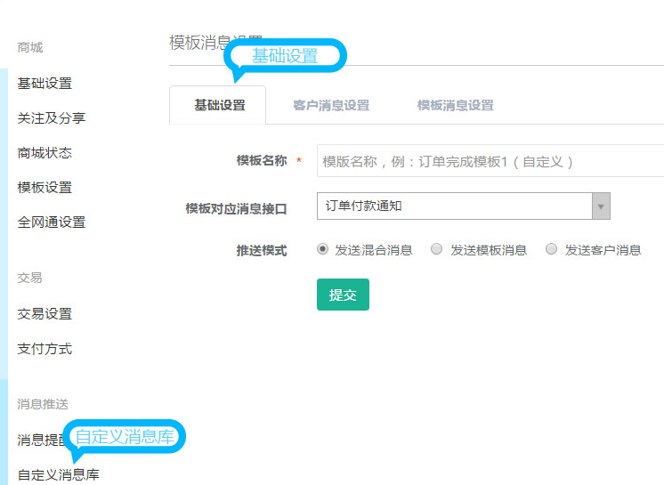 首先要在基礎(chǔ)設(shè)置中選擇需要推送的模式,然后在選擇相應(yīng)的模板對應(yīng)接口,單機(jī)設(shè)置——自定義消息庫——基礎(chǔ)設(shè)置,參見下圖: