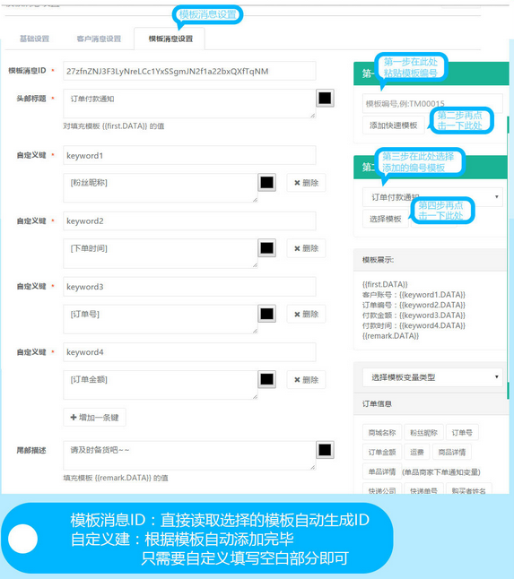 模板消息設(shè)置,直接在接入的公眾號中選擇復(fù)制需要使用的模板編號;