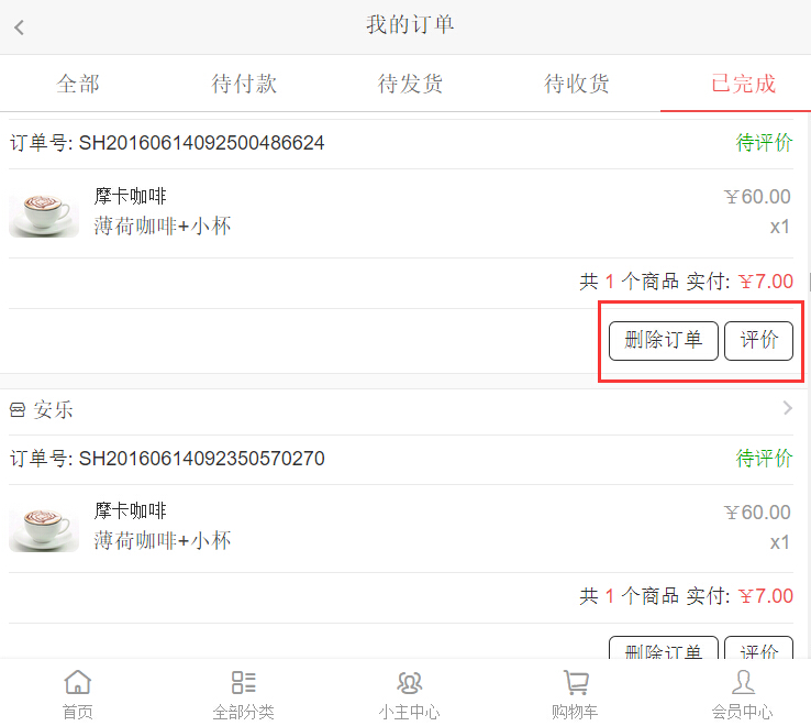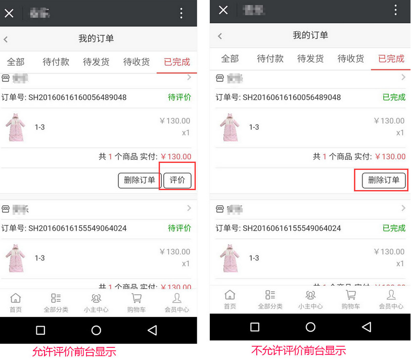 例如:設(shè)置訂單完成7天后可發(fā)起退款或換貨申請,則買家或系統(tǒng)確認(rèn)收貨7天內(nèi)(包含當(dāng)天),可發(fā)起售后申請,超過則不允許售后申請,只有待評價(jià)與刪除訂單,參見下圖: