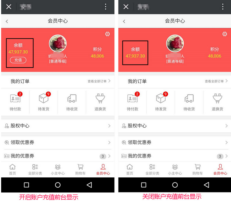 4、開啟賬戶充值,會員在手機(jī)端就可以進(jìn)行在商城賬戶余額中進(jìn)行充值金額,反之則不能充值,參見下圖: