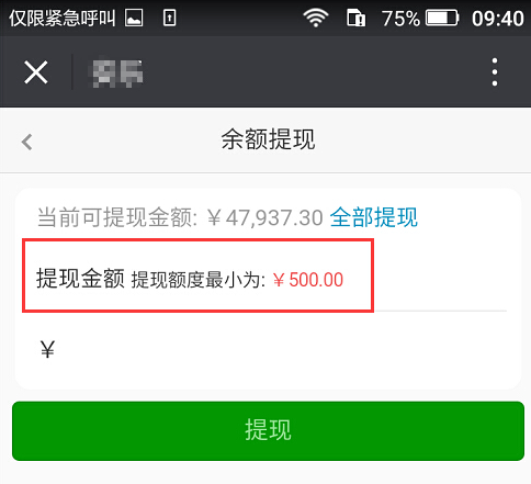 例如:余額提現(xiàn)限制設(shè)置滿500元才能申請?zhí)岈F(xiàn),則只有余額超過500元的才能申請,小于500元的不能申請,參見下圖:
