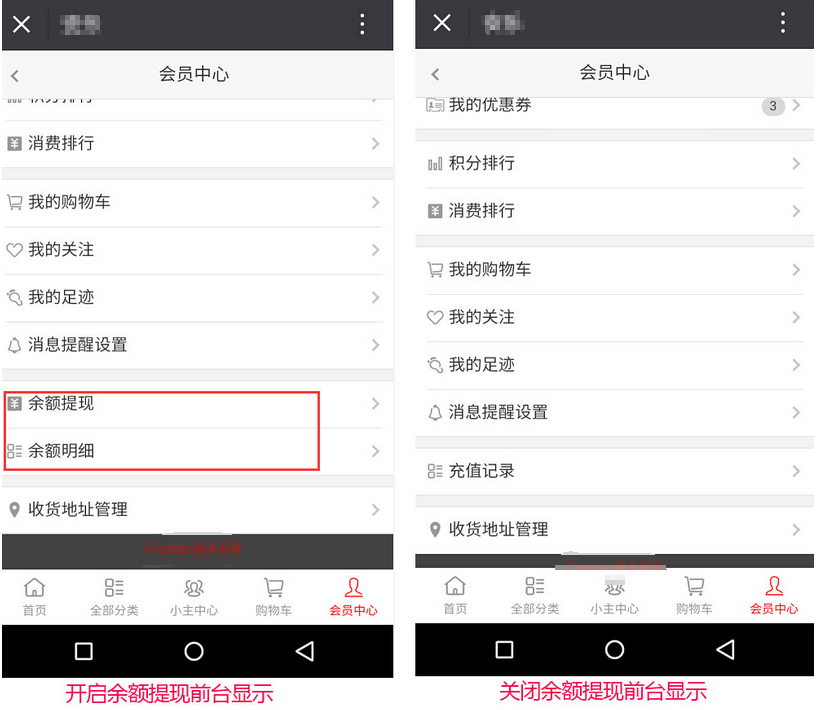 5、開啟“余額提現(xiàn)”用戶才能在手機(jī)端【會員中心】進(jìn)行發(fā)起余額提現(xiàn)申請,關(guān)閉則不能提現(xiàn),參見下圖: