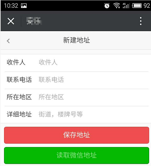 9、開啟獲取微信共享收貨地址后,買家購買商品添加收貨地址時(shí),可直接點(diǎn)擊“讀取微信地址”,反之則不能讀取,參見下圖: