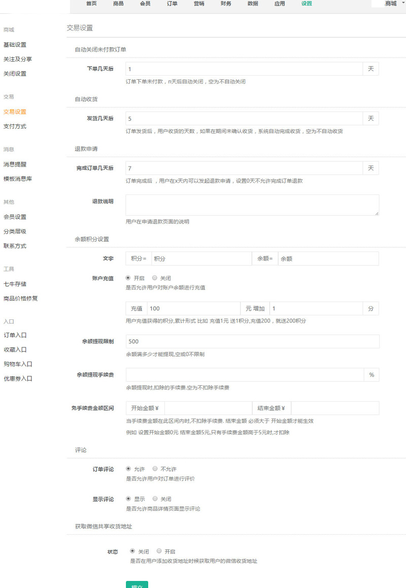 3、訂單完成n天內(nèi)可發(fā)起退款申請,如果設(shè)置0則不允許完成訂單退款。