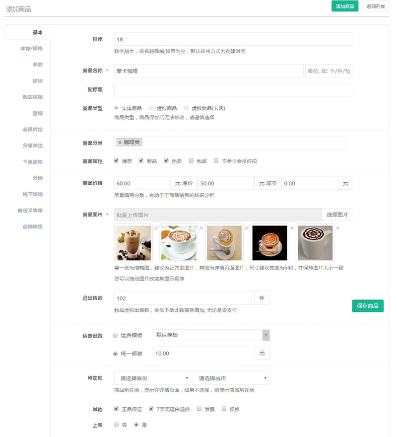 “商品分類”選擇已添加設置的分類信息即可,點擊查看商品分類操作鏈接。