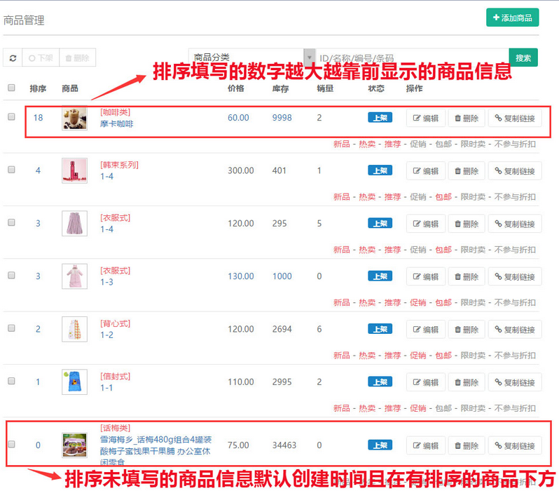 商品的排序是按照“基本”中填寫的數(shù)字信息進行排序的,數(shù)字越大信息越靠前顯示,如不填寫則默認為創(chuàng)建添加的商品日期,添加的商品越晚則信息會越靠前顯示,添加的商品會在已填寫數(shù)字排序的最下方顯示,參見下圖: