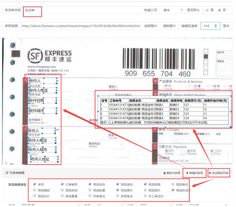 6.5跟快遞單不同的是發(fā)貨單多了一個(gè)發(fā)貨商品列表,可跟需要設(shè)置列表的內(nèi)容