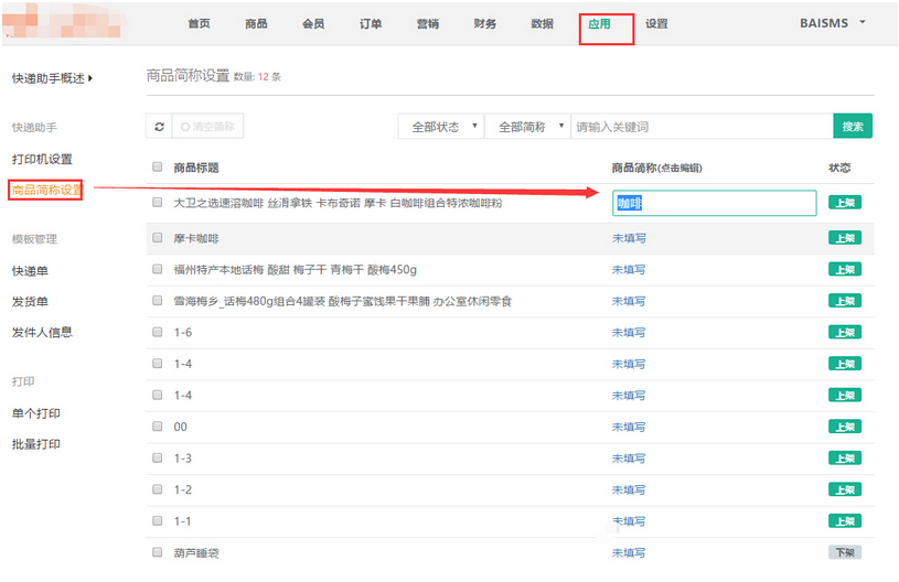 9 商品簡(jiǎn)稱編輯 應(yīng)用->快遞助手->商品簡(jiǎn)稱設(shè)置(未編輯的點(diǎn)擊未填寫即可編輯,已編輯需修改的點(diǎn)擊簡(jiǎn)稱即可修改)