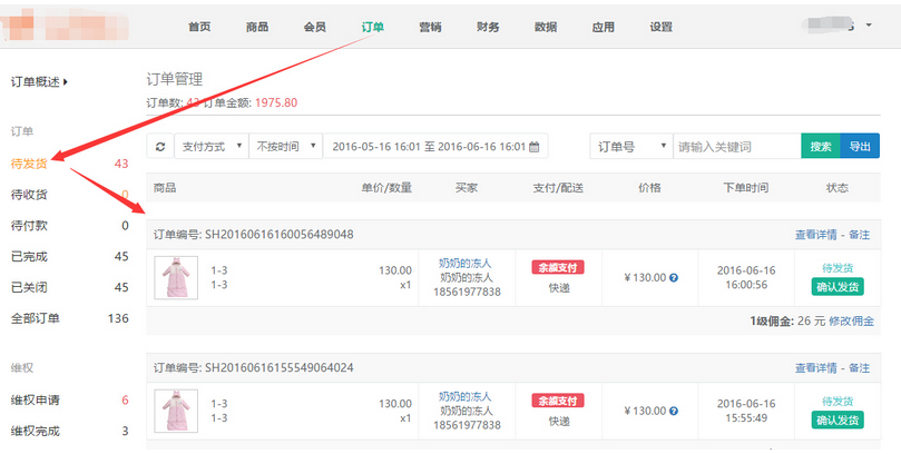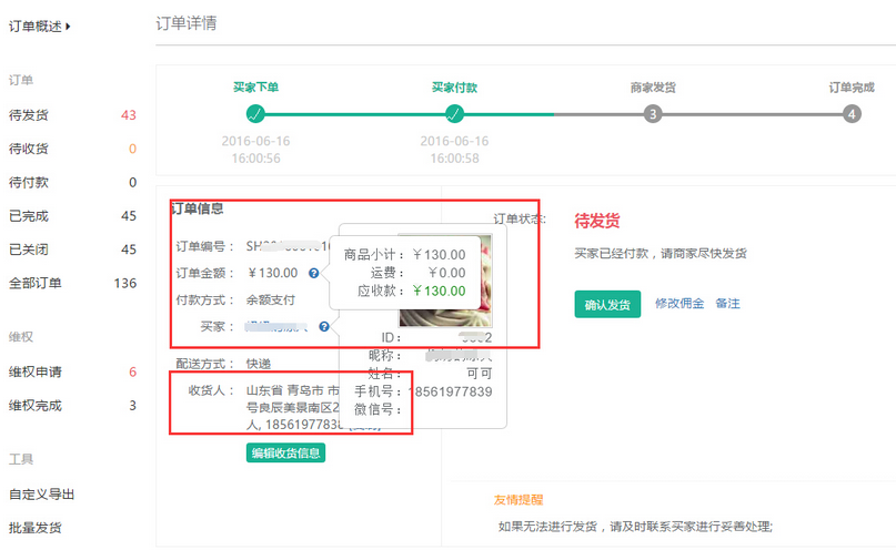 商家在【待發(fā)貨】訂單頁面中,可查看不同分銷商等級所獲取的傭金金額,點擊【查看詳情】可已查看訂單信息及買家的收貨信息,參見下圖: