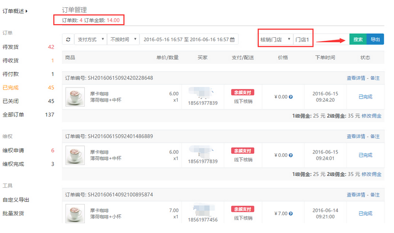 如果商家搜索查看線下核銷某門店的核銷訂單量,則在【已完成】列表中,選擇核銷門店輸入核銷的門店名稱,點擊搜索,則列出的已完成訂單為該門店的核銷量,參見下圖:
