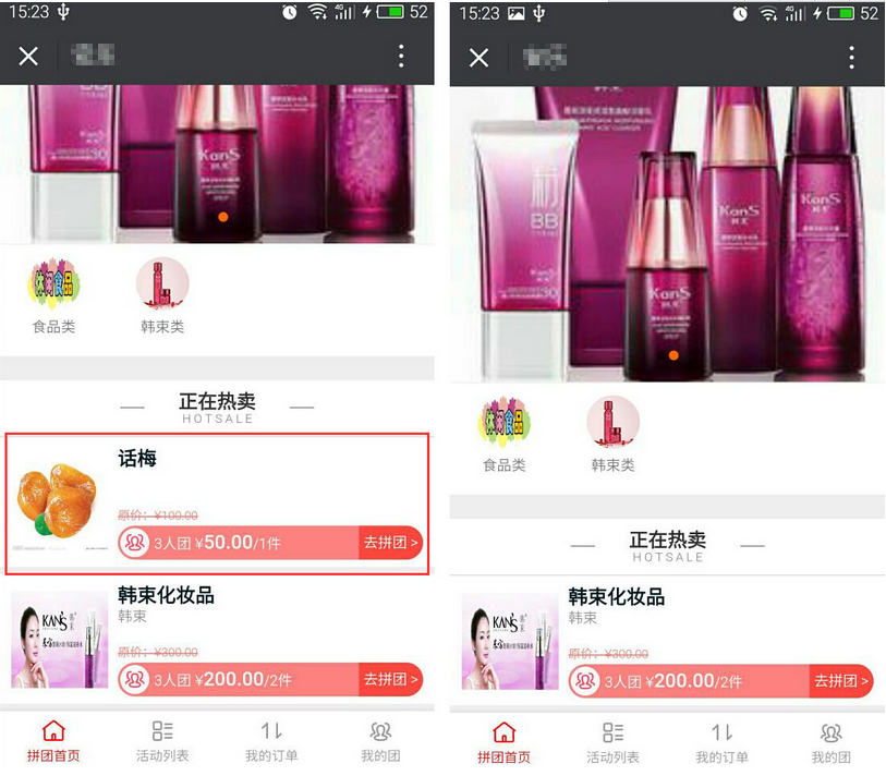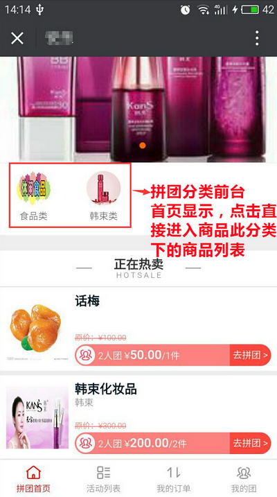 排序數(shù)字填寫的越大,越靠前顯示,選擇“是否拼團(tuán)首頁(yè)顯示”為“是”時(shí),則會(huì)在前臺(tái)顯示分類,點(diǎn)擊即可進(jìn)入分類下的商品,反之則不顯示,參見下圖: