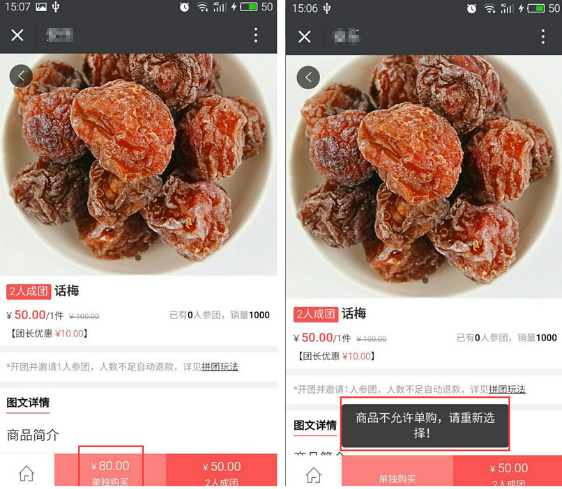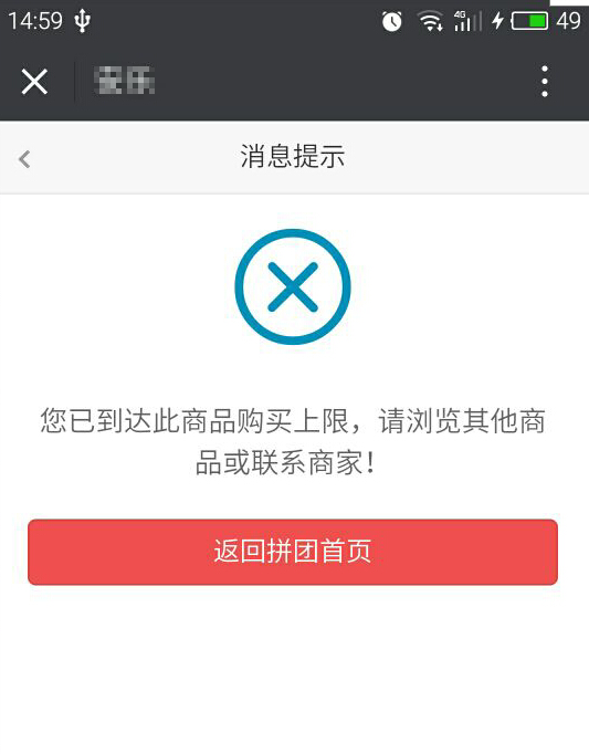 3、購(gòu)買次數(shù)限制填寫是限制買家個(gè)人購(gòu)買商品的次數(shù),如果不設(shè)置則沒有次數(shù)限制,例如次數(shù)限制為1此,則買家拼團(tuán)購(gòu)買過此商品后再次購(gòu)買時(shí),系統(tǒng)會(huì)給予相應(yīng)提示,參見下圖: