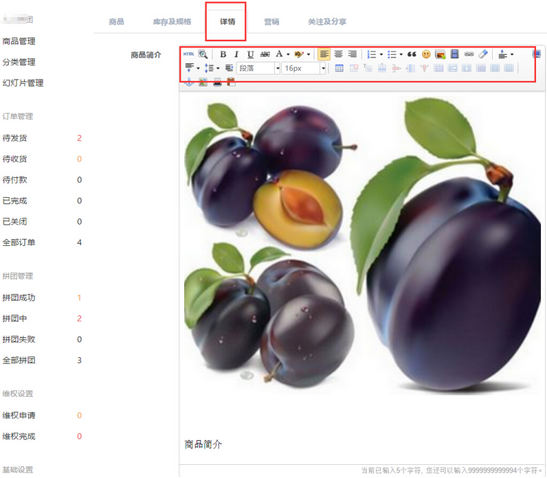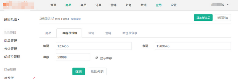 【商品管理】——【添加商品/編輯商品】,設(shè)置商品的基本信息,商品庫(kù)存、詳情,商品的營(yíng)銷活動(dòng)等,下圖為設(shè)置添加商品信息: