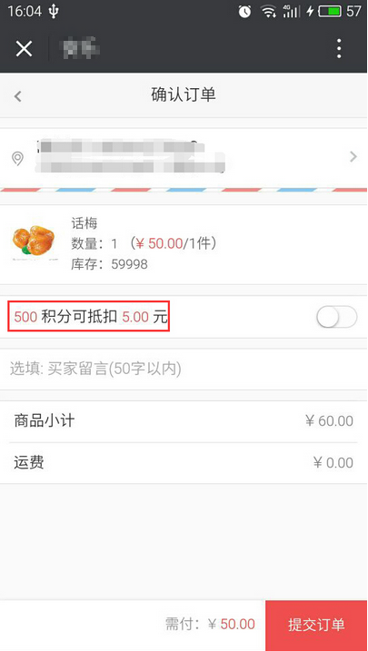 1、設(shè)置最多積分抵扣金額,買家購(gòu)買商品確認(rèn)提交訂單時(shí),可用現(xiàn)有的積分進(jìn)行金額相抵扣(積分抵扣必須在【基礎(chǔ)設(shè)置】——【交易管理】中選擇開啟),參見下圖: