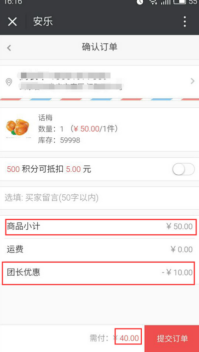 例如:選擇的優(yōu)惠方式為金額,設(shè)置優(yōu)惠金額為10元,開團(tuán)的買家購(gòu)買商品為50元,則團(tuán)長(zhǎng)確認(rèn)提交訂單時(shí)只需付款50-10=40元即可,參見下圖: