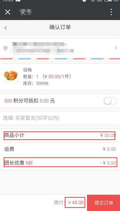 選擇的優(yōu)惠方式是折扣,設(shè)置優(yōu)惠折扣為90%,開團(tuán)的買家購(gòu)買商品為50元,則團(tuán)長(zhǎng)確認(rèn)提交訂單時(shí)只需付款50*90%=45元即可,參見下圖: