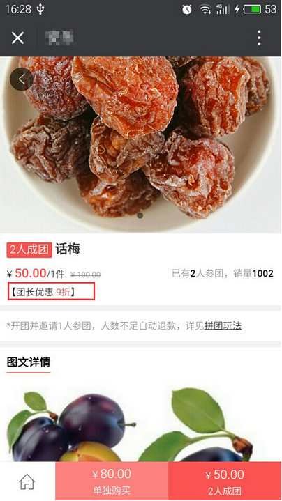 3、“是否顯示團(tuán)長(zhǎng)優(yōu)惠”選擇“是”則設(shè)置的營(yíng)銷優(yōu)惠就會(huì)在前臺(tái)顯示,買家開團(tuán)前即可看到優(yōu)惠的金額或折扣,反之則不顯示,參見下圖: