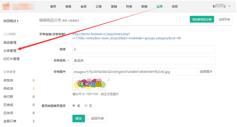 添加商品前首先要添加拼團(tuán)商品的分類,點(diǎn)擊【應(yīng)用】——【聆科拼團(tuán)】——【分類管理】,參見下圖: