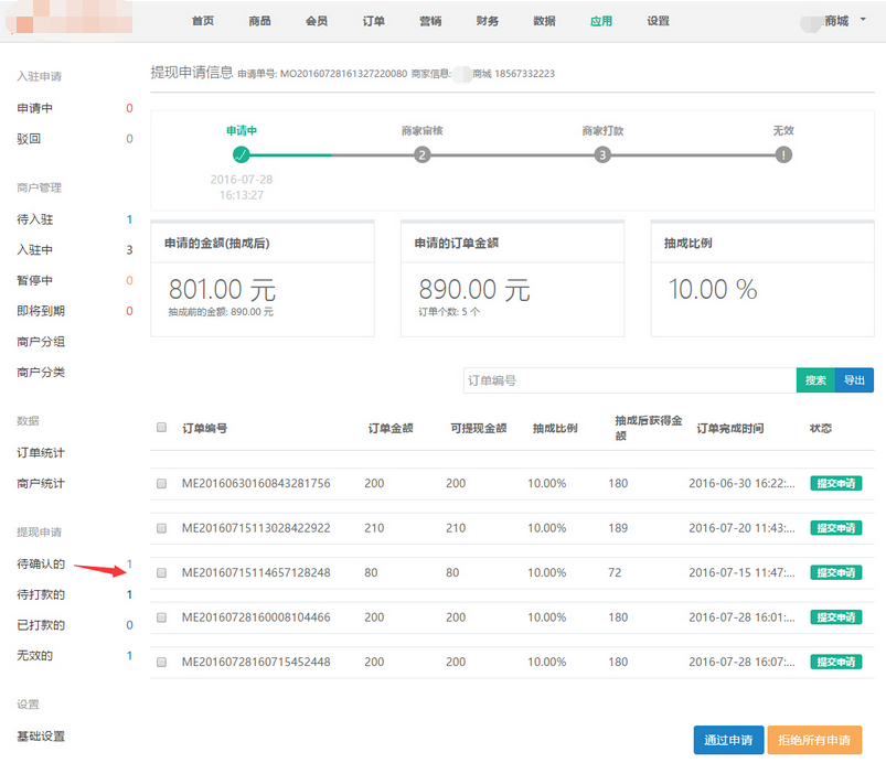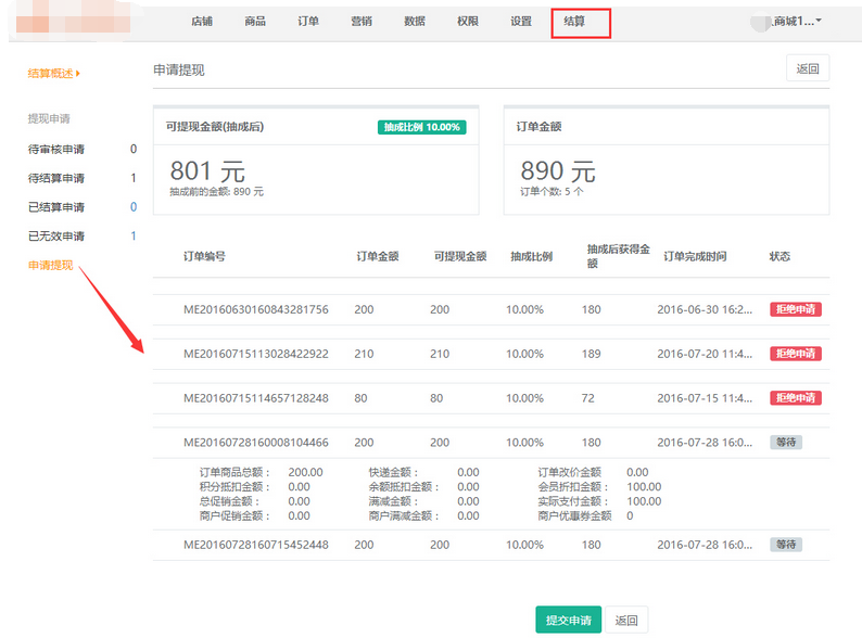 多商戶點擊訂單可查看訂單的信息,點擊【提交申請】后所有的“等待”提現(xiàn)申請狀態(tài)的訂單,全部提交,系統(tǒng)暫不支持勾選訂單進(jìn)行申請?zhí)岈F(xiàn)。