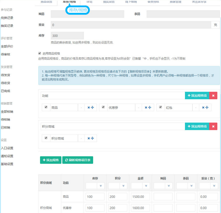 積分商城的商品支持設(shè)置多規(guī)格,具體操作如下: