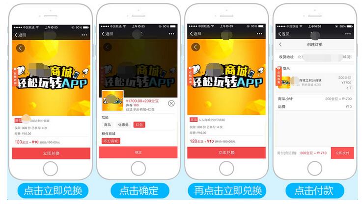 其操作規(guī)則與商城商品啟用商品規(guī)格一致,會員點擊【立即兌換】選擇相應(yīng)的規(guī)格后,要再次點擊【立即兌換】,才到支付頁面,參見下圖: